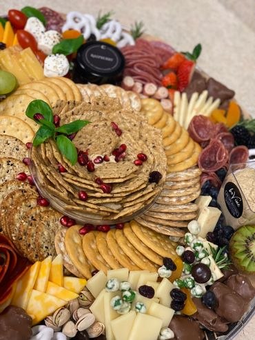 A stunning selection of both local and imported meats and cheeses- a separate cracker tray is included and condiments are staged elegantly on the tray. This 20 inch round tray is perfect for small gatherings feeding 5-8 people