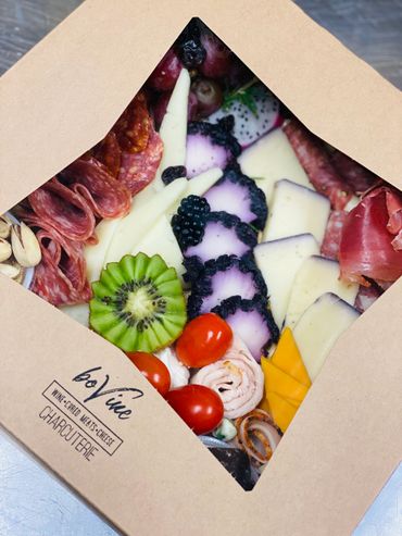A delicious 15 inch rectangle charcuterie tray in a box with savory local and imported meats and cheeses. A separate cracker tray is included. feeds 3-6 people